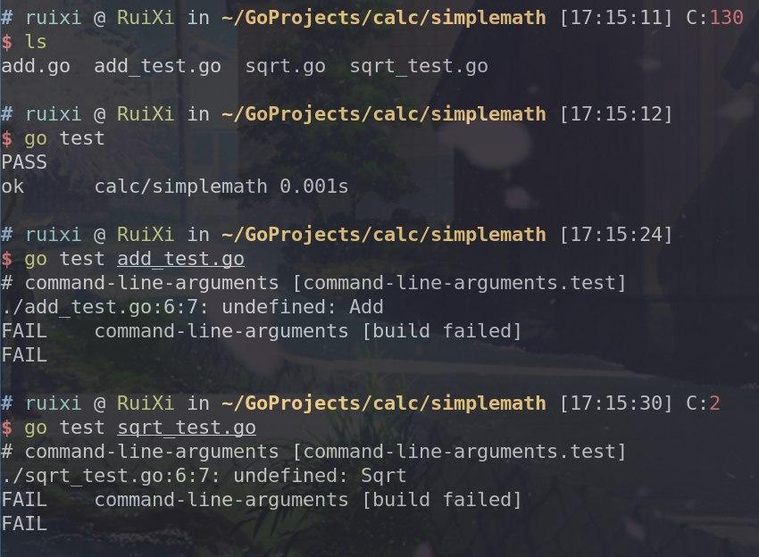 知道了原因之后,解决的方法就出来了,执行命令时加入这个测试文件需要引用的源码文件,在命令行后方的文件都会被加载到command-line-arguments中进行编译。。示例如下: